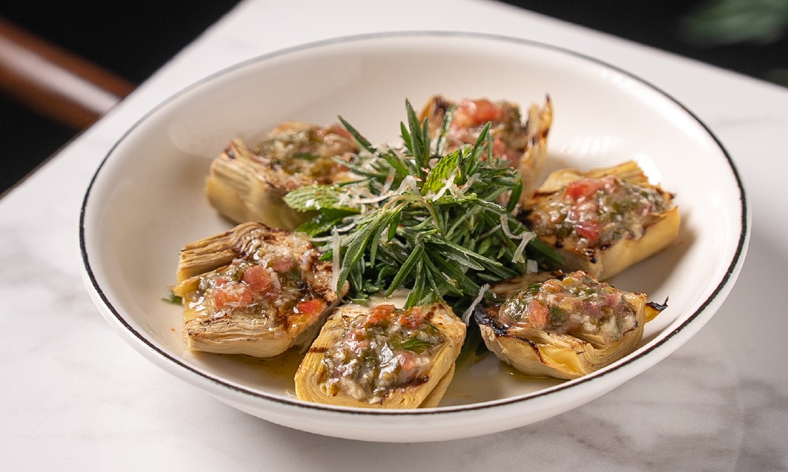 Fresh mixed tomatoes, creamy burrata cheese, basil pesto, cucumber, mint, basil, arugula and caramelized pine nuts drizzled with sumac dressing