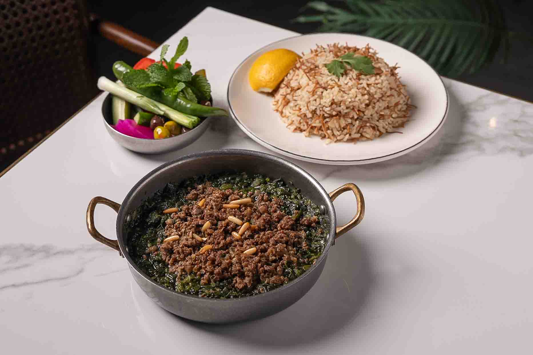 Creamy hummus topped with tenderloin ras asfour sauteed in molasses, sprinkled with pine nuts and sumac